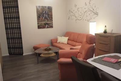 4,0Ferienwohnung 9: im Obergeschoss, modern eingerichtetes Wohnzimmer mit großzügigen Essbereich,Satelliten-TV, Flachbildschirm, CD-Radio. 1 Schlafzimmer, (2 Betten). komplett ausgestatte Küche (Elektroherd , Kühlschrank mit Gefrierfach, Kaffeemaschine, Toaster