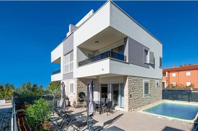 Modernes Ferienhaus in der Nähe der Brijuni Inseln, mit zwei Schlafzimmer, privaten Pool und wundervollen Panoramameerblick. Villa Valencan 3 ist ein schönes Ferienhaus (Doppelhaushälfte) auf drei Etagen im Ort Betiga, nur 1 km vom schönen Kieselstrand und