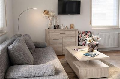 Traumferienwohnung Kinzigblick Haus: In der linken Seite der Ferienwohnung befindet sich das offene Wohn- und Esszimmer. Das Sofa als auch der Tisch laden zum Zusammensitzen, Essen, Trinken und Wohlfühlen ein. Ein Badezimmer mit Dusche/Wanne als auch ein