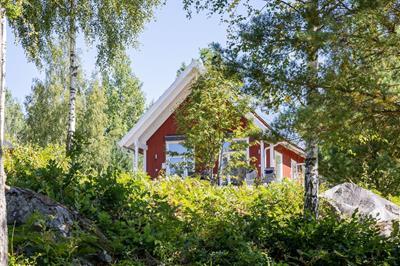 4,4"Skogstorp", 4-Zimmer-Haus 75 m2 auf 2 Stockwerken. Modern und gemütlich eingerichtet: offenes Wohn-/Esszimmer mit Schiebetür, Panoramafenster mit Schwedenofen, Esstisch und DVD. Ausgang zur Veranda. 1 Zimmer mit 1 Doppelbett. 1 Zimmer mit 1 x 2 Etagenbetten.