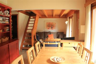 4,0"Le Jet d'Eau 19", 6-Zimmer-Chalet 250 m2. Komfortabel und geschmackvoll eingerichtet: Wohn-/Esszimmer mit Schwedenofen und TV. Ausgang zur Terrasse. 1 Zimmer mit 1 Doppelbett (2 x 90 cm, Länge 200 cm), Dusche/WC. Küche (Backofen, Geschirrspüler, 4
