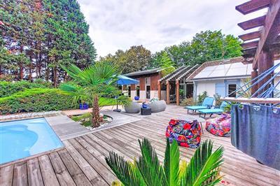 4,5"Labenne Océan", 4-Zimmer-Haus 110 m2 auf 2 Stockwerken. Komfortabel eingerichtet: Wohn-/Esszimmer mit Esstisch und Sat-TV (Flachbildschirm). Ausgang zur Terrasse. 1 Zimmer mit 1 franz. Bett (160 cm, Länge 200 cm), Sat-TV. Ausgang zur Terrasse. 1 Zimmer mit 1