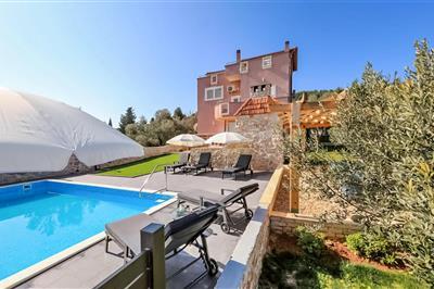 Modernes Ferienhaus im mediterranen Stil, bestehend aus zwei Wohneinheiten, die mit Außentreppen miteinander verbunden sind. Es ist ideal für zwei befreundete Familien, die ihren Urlaub zusammen verbringen, aber dennoch Privatsphäre haben möchten. Die