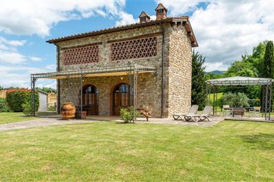 Genießen Sie Ruhe in der Natur und rustikale Gemütlichkeit in diesem toskanischen Ferienhaus mit Sauna, Whirlpool und Panoramablick. Eingebettet in ein gepflegtes Grundstück und umgeben von einer bezaubernden Naturlandschaft können Sie in diesem