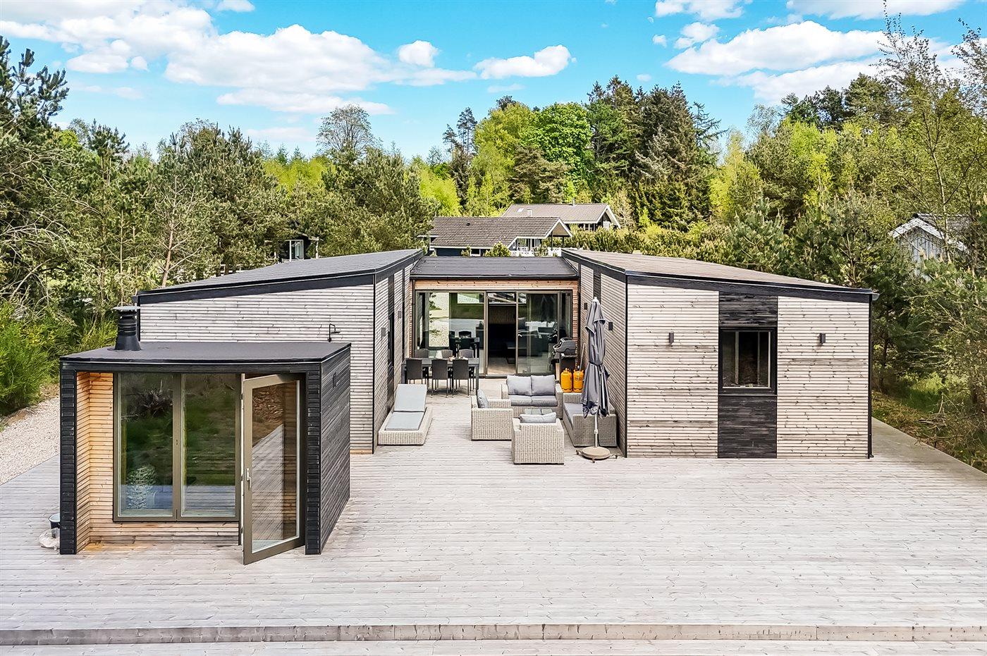 Ein schönes und neu gebautes (2024) Haus in Fuglslev bei Ebeltoft. Das Ferienhaus in drei Flügeln ist der ideale Ausgangspunkt für mehrere Familien, die gerne jeweils ihren eigenen Bereich haben möchten. Draußen gibt es eine große und schöne Terrasse sowie