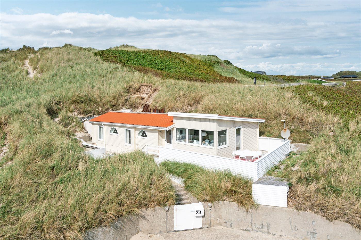 4,5Fahren Sie durch die kleinen Straßen bis zu den hohen Dünen, wo sich dieses wunderschöne Ferienhaus oberhalb der Straße in der extremen Klippe zum Strand und zur Nordsee befindet. Das Haus ist in der Düne gut geschützt vom Westwind, und mit seiner hohen Lage