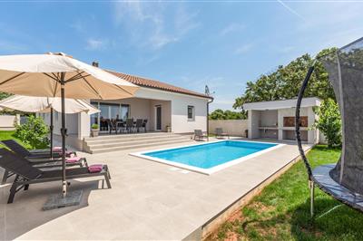 4,0In Galižana, nicht weit entfernt von der Stadt Pula, befindet sich dieses moderne Ferienhaus. Große Fenster zeichnen dieses Feriendomizil aus und sorgen für ein helles und freundliches Interieur, das mit geschmackvoller Einrichtung für hohen Komfort sorgt.