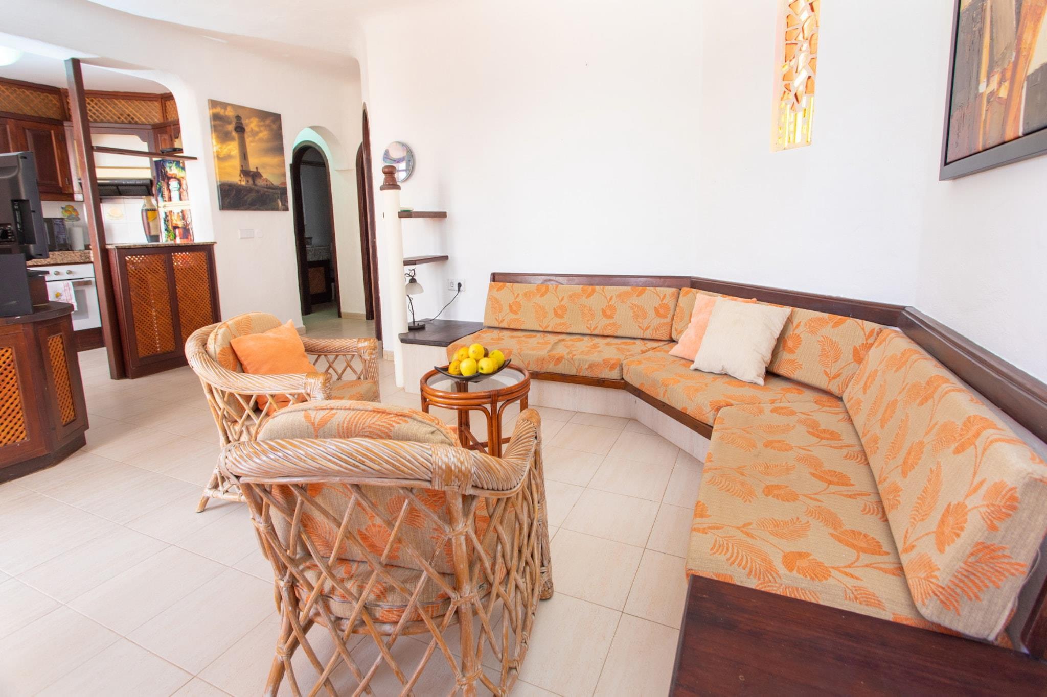 4,0"Duplex Sonnenland Los Tinos II 34 RB", 2-Zimmer-Wohnung 120 m2. Objekt geeignet für 2 Erwachsene. Sehr zweckmässig und gemütlich eingerichtet: Wohnzimmer mit Essecke, TV, Flachbildschirm und Klimaanlage. Ausgang zur Terrasse. 1 Zimmer mit 1 Doppelbett (135