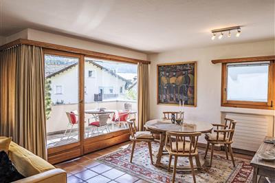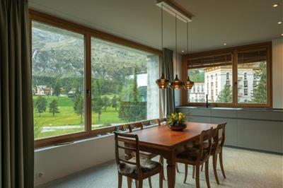 4,6"Chesa Piz Mezdi - St. Moritz", 3-Zimmer-Wohnung 120 m2 im 2. Stock. Geräumig und hell, komfortabel und stilvoll eingerichtet: offenes Wohn-/Esszimmer mit Panoramafenster mit Esstisch, Küchenblock und TV (Flachbildschirm). Ausgang zur Terrasse, Richtung