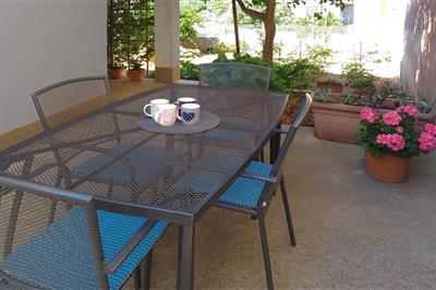 5,05-Zimmer-Haus 85 m2 auf 2 Stockwerken, Südwestlage. Schön eingerichtet: Wohn-/Esszimmer 40 m2 mit Sat-TV (Flachbildschirm), Klimaanlage. Ausgang zum Garten. 1 Zimmer mit 1 franz. Bett (180 cm, Länge 200 cm). 1 Zimmer mit 2 Betten (90 cm, Länge 200 cm). Offene
