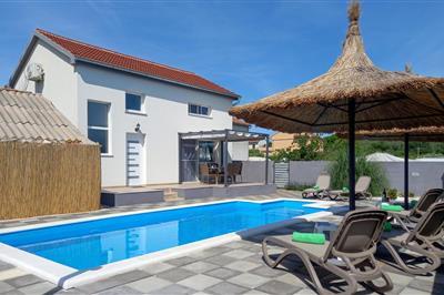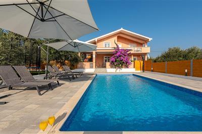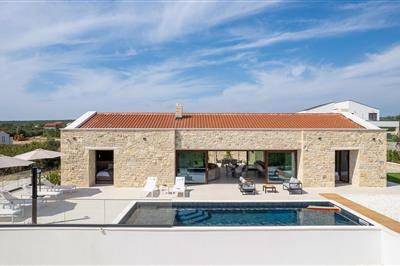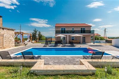 Willkommen in diesem luxuriösen Ferienhaus, dem idealen Ort für einen erholsamen Urlaub. Genießen Sie den atemberaubenden Ausblick auf das grüne Hinterland der Region Zadar, der sich Ihnen von der großzügigen Terrasse und dem Poolbereich aus bietet.