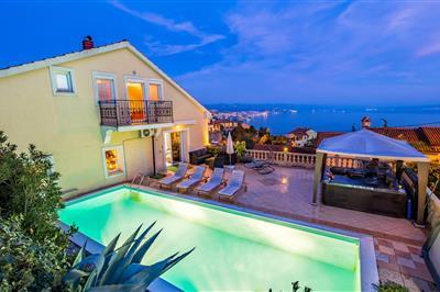Auf der Insel Cres, in dem kleinen ruhigen Küstenort Miholascica, befindet sich dieses komfortable Ferienhaus mit Pool. Das geräumige Haus erstreckt sich über zwei Etagen und verfügt im Dachgeschoss über Dachschrägen, die auf ca. 120 cm heruntergehen. Im