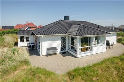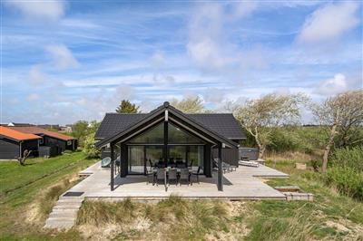 4,5Dieses hübsche Ferienhaus aus Holz, 2002 gebaut, liegt auf einem schönen Naturgrundstück mit Aussicht über das Naturschutzgebiet und dicht an einem der besten Sandstrände Nordeuropas. Zum Haus gehört ein großes, offenes Terrassenareal mit Gartenmöbeln und