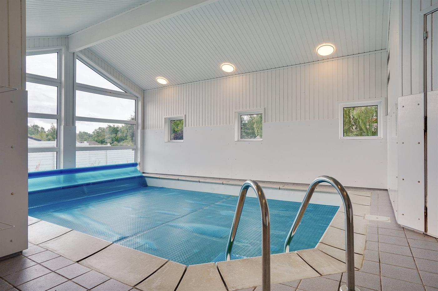 3,8In hoher Lage auf einem abschüssigen Naturgrundstück im Gebiet Lyngsbæk Bakker und mit kurzer Entfernung zum Strand steht dieses tolle Ferienhaus mit Innenpool, Sauna und Whirlpool. Die große, nach Westen gewandte Holzterrasse mit Zugang vom Wohnzimmer ist