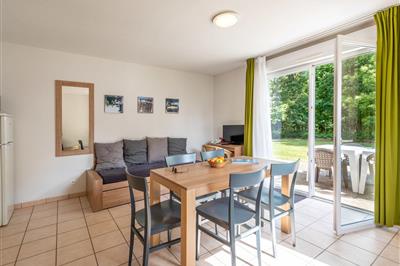 3,6"Cottage Confort 4 Pers.", 2-Zimmer-Reihenhaus 39 m2 auf 2 Stockwerken. Zweckmässig eingerichtet: Wohnzimmer mit 1 Ausziehbett (2 Pers. 2 x 80 cm, Länge 190 cm), Essecke und TV. Ausgang zur Terrasse. Kochnische (Geschirrspüler, 4 Glaskeramikplatten, Toaster,