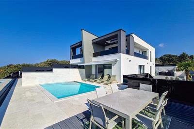 Die wunderschöne und modern gebaute Villa Mandre liegt auf der Westseite der Insel Pag, im malerischen Küstendorf Mandre in Norddalmatien. Das angenehme Ambiente des Gartens mit mediterraner Bepflanzung hat eine Fläche von 850m2 und die Villa Mandre selbst