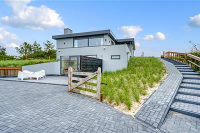 Verbringen Sie einen wunderbaren Urlaub in diesem hoch auf der Düne gelegenen Ferienhaus mit Sauna und wunderschöner Aussichtüber das Dorf. Das stilvolle Wohnzimmer mit Buntglasfenstern, viel Licht, großem Flachbildfernseher, schönem Kamin, Esstisch für 8