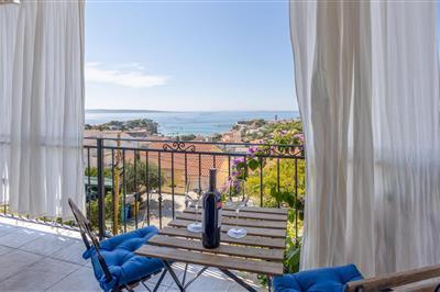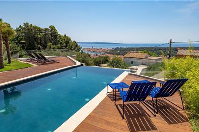 Genießen Sie ein traumhaftes Meerespanorama in diesem komfortablen Ferienhaus mit Pool und eigenem Tennisplatz. Auf einem weitläufigen Grundstück begrüßt Sie überaus komfortable Haus, das mit seinen Balustraden und Säulen an einen Palast erinnert. Auch im