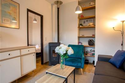 4,2"Plein Océan", 3-Zimmer-Reihenhaus 40 m2, Südwestlage. Komfortabel eingerichtet: Wohn-/Esszimmer mit offenem Kamin und TV (Flachbildschirm). Ausgang zur Terrasse. 1 Zimmer mit 1 franz. Bett (1 x 140 cm, Länge 200 cm). 1 kleines Kinderzimmer mit 1 x 2
