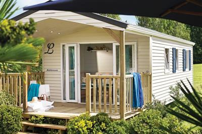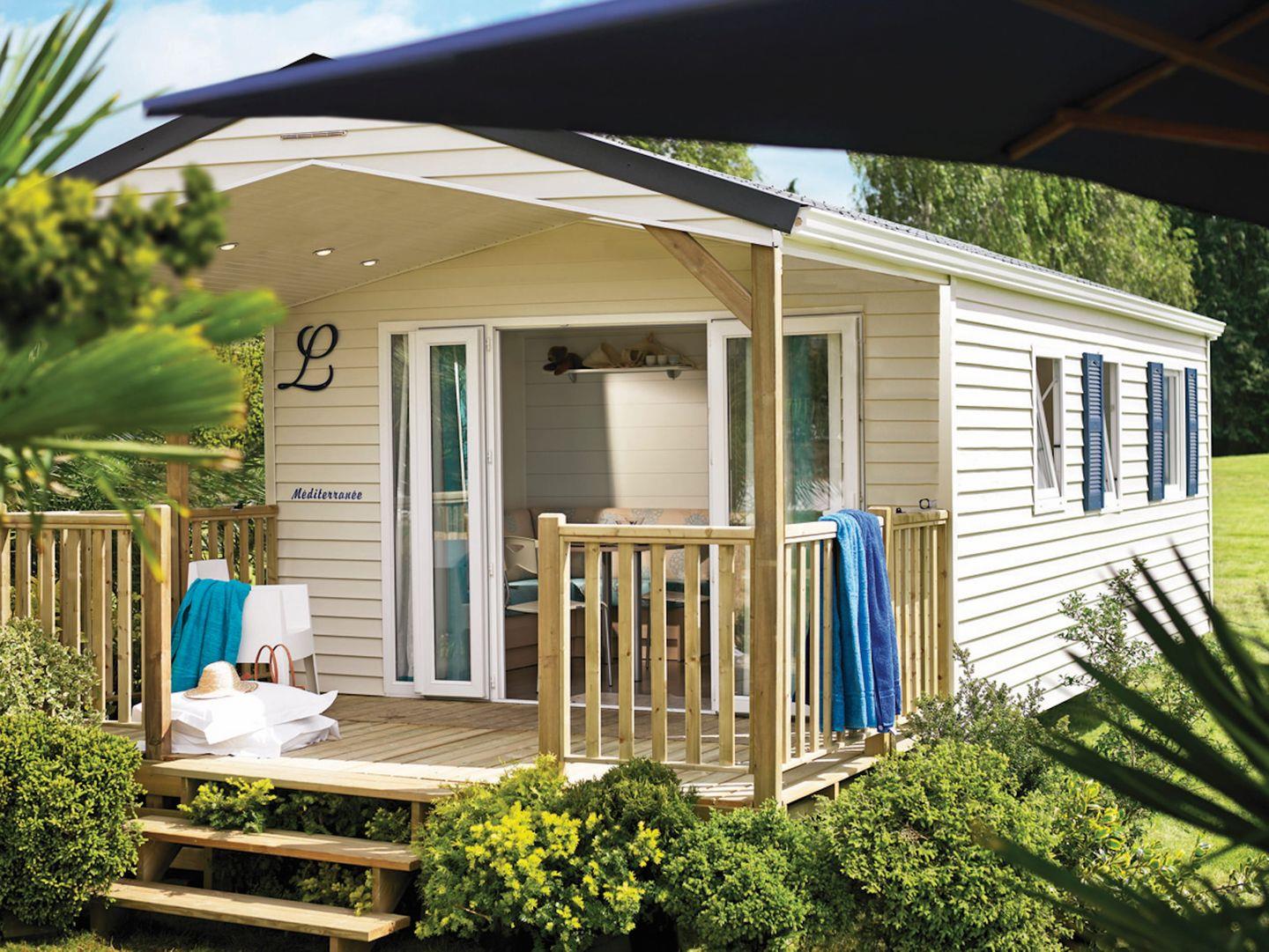 Mobilheim Méditerranée mit Terrasse für 4 Personen im Ferienpark AM WALDRAND Unsere Mobilheime Typ Méditerranée im Ferienpark AM WALDRAND sind nur 350 m vom Strand entfernt. Über vier Stufen kommen Sie auf die Terrasse und in den offenen Wohnraum mit