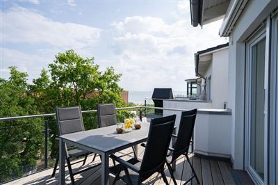 4,9Pe Villa Meeresrauschen App.37 Durch seine strandnahe Lage macht das Haus seinem Namen alle Ehre. Hier befindet sich diese komfortable, moderne 3-Zimmer-Fewo in der 3.Etage mit zwei Balkonen und einer wunderbaren 30 qm Dachterrasse mit Loungemöbeln. Die