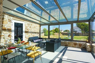 3,4"L'Iroise", 4-Zimmer-Haus 100 m2 auf 2 Stockwerken, Südlage. Schön und rustikal eingerichtet: grosses Wohn-/Esszimmer mit Veranda, Panoramafenster mit Schwedenofen, Esstisch und TV (Flachbildschirm). Ausgang zur Terrasse. Kleine, offene Küche (Backofen,