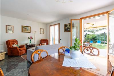 4,7"La Casetta", 3-Zimmer-Haus 140 m2. Gemütlich eingerichtet: Wohn-/Esszimmer mit Esstisch und Sat-TV. Ausgang zum Garten. 1 Zimmer mit 2 Betten (80 cm). 1 Zimmer mit 1 franz. Bett (160 cm). Küche (Backofen, Geschirrspüler, 6 Flammen, Toaster, Wasserkocher,