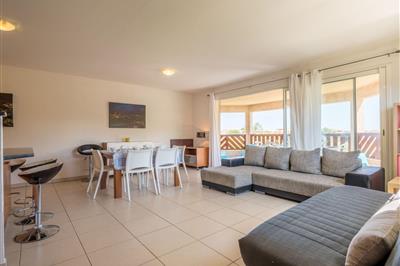 3,33-Zimmer-Wohnung 50 m2, im Erdgeschoss. Wohn-/Esszimmer mit TV und Klimaanlage. Ausgang zur Terrasse. 1 Zimmer mit 1 franz. Bett (160 cm, Länge 200 cm). 1 Zimmer mit 1 Doppeldiwanbett (140 cm, Länge 190 cm), TV (Flachbildschirm). Kochnische (Backofen,