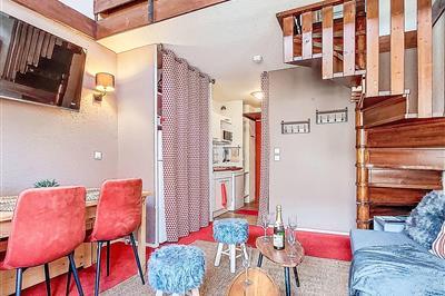 2,8"Résidence Les Olympiades B 723", 3-Zimmer-Wohnung im 7. Stock, Nordlage. Schön und gemütlich eingerichtet: Wohn-/Esszimmer mit 1 Doppeldiwanbett (1 x 160 cm, Länge 200 cm), Esstisch und TV (Flachbildschirm), E-Heizung. Ausgang zum Balkon, Richtung Norden.