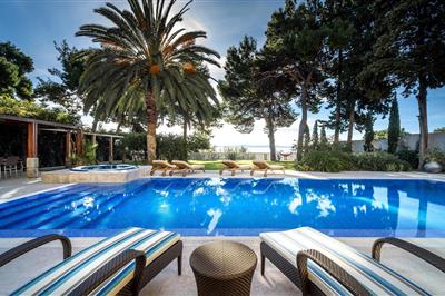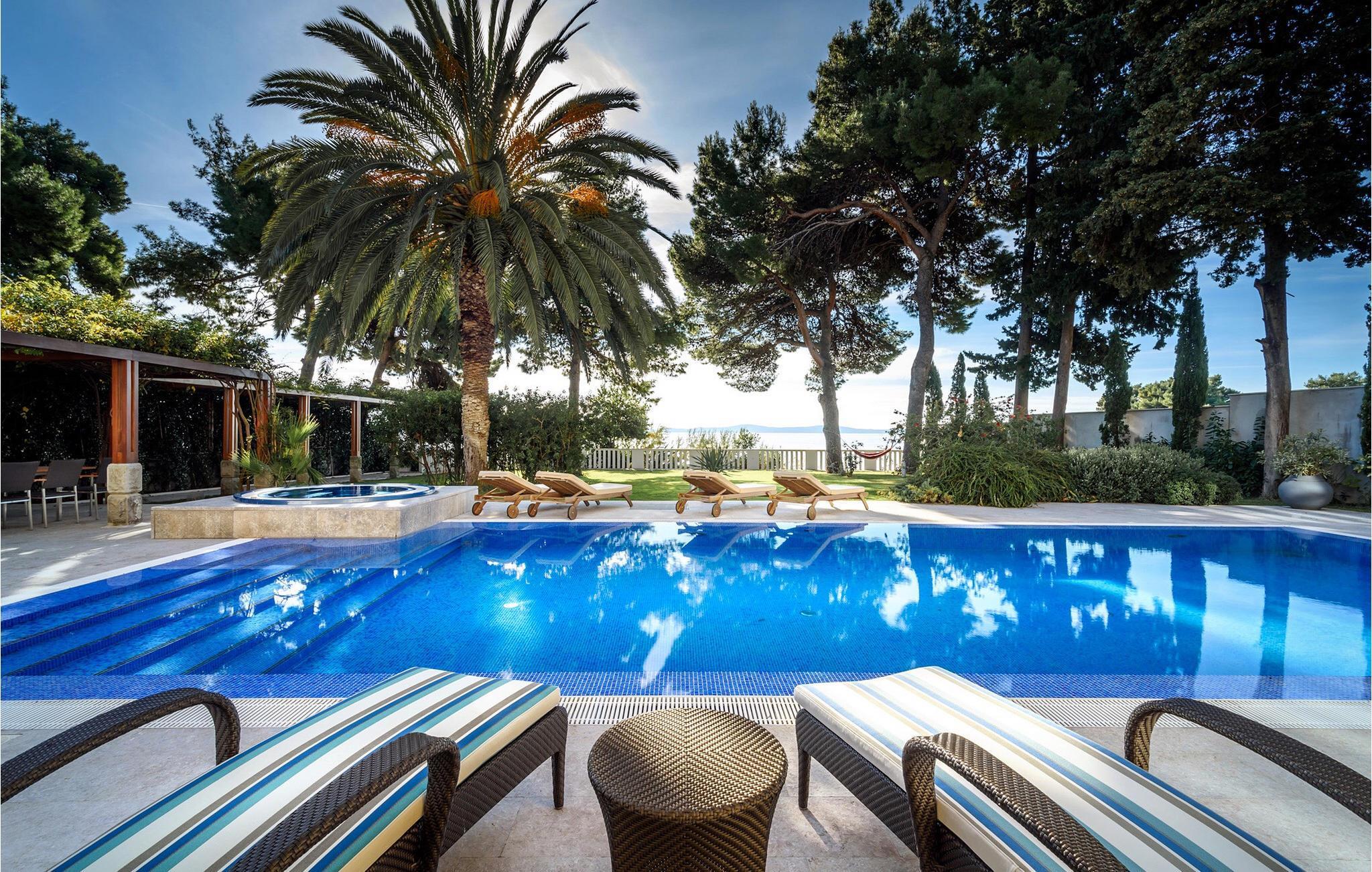 Die komfortable Villa mit Pool in Split liegt in besonders ruhiger Nachbarschaft. Einer der schönsten Strände – Trstenik - ist nur zwei Minuten zu Fuß entfernt. Im Erdgeschoss vorhanden sind ein Freizeitraum mit Fitnessgeräten, eine Massage-Badewanne und eine