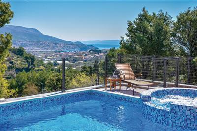 Modernes, luxuriöses Ferienhaus mit bester Aussicht über Split. Gelegen in einer ruhigen und friedlichen Gegend etwas abseits von der fantastischen Stadt Split, beziehen Sie diese stilvolle Villa mit beheiztem Swimmingpool, Sauna und Jacuzzi. Fernab des