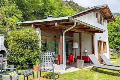 5,02-Zimmer-Haus 60 m2 auf 2 Stockwerken. Komfortabel und geschmackvoll eingerichtet: Wohn-/Schlafzimmer mit Panoramafenster mit 1 Diwanbett, Schwedenofen und Sat-TV. Ausgang zum Gartensitzplatz. Küche (Backofen, Geschirrspüler, 4 Induktionskochplatten,