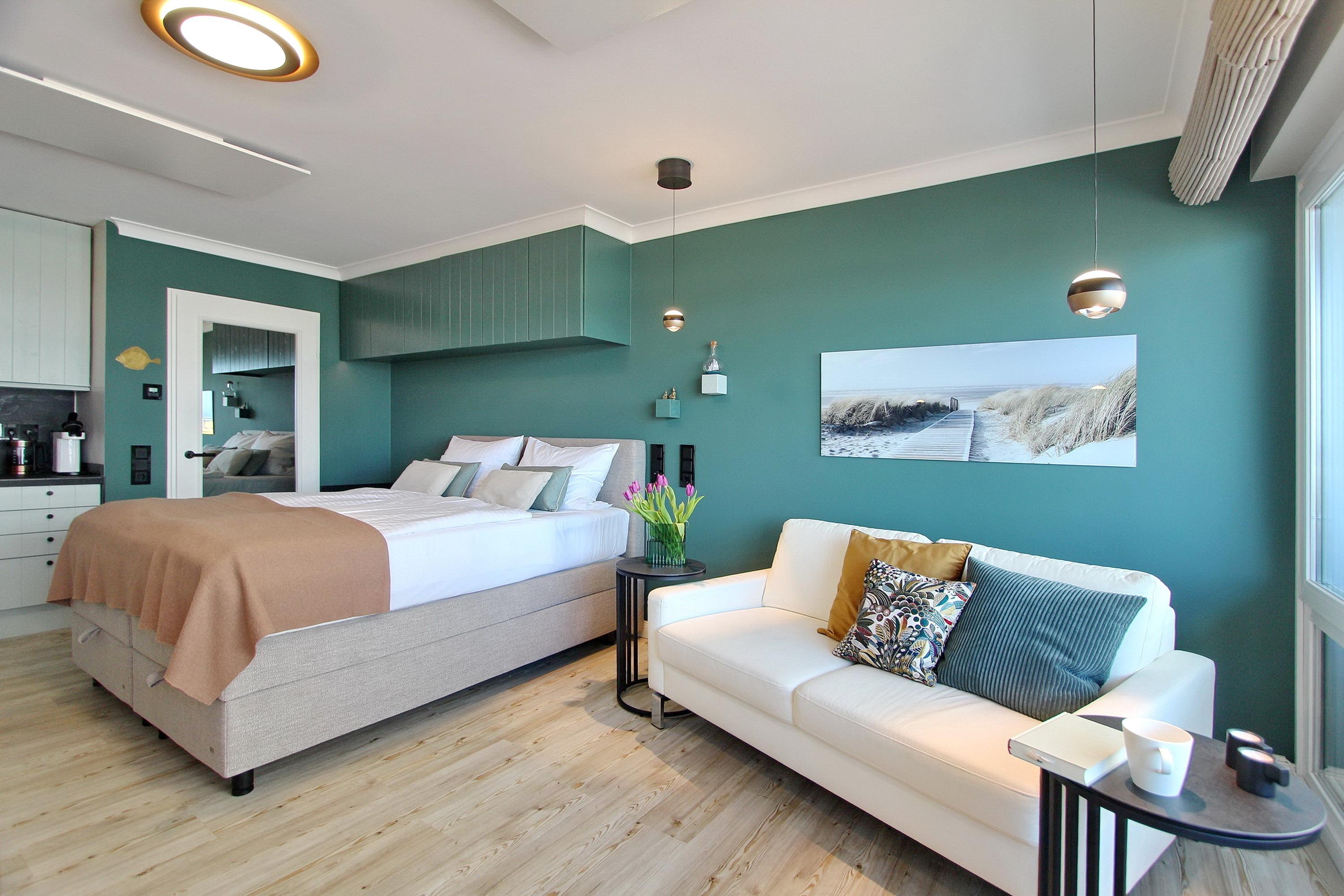 Ferienwohnung/App. für 4 Gäste mit 45m² in Westerland (307727) (1. Stock) Moderne 1,5-Zi.-Ferienwohnung, ca. 45m², 1.OG, max. 2 Erwachsene und 2 Kinder. Nichtraucher-Whg.! [nbsp]Wohnzimmer mit Boxspringbett (160x200) - (Neu ab Juni 2025), Couch, 1 Sessel,