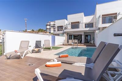 4,0"Atardecer", 5-Zimmer-Villa 230 m2. Komfortabel und schön eingerichtet: Wohn-/Esszimmer mit Kabel-TV (Flachbildschirm), Radio und Stereoanlage. Ausgang zum Gartensitzplatz. 1 Zimmer mit 2 Betten (90 cm, Länge 190 cm), Klimaanlage und Warmluftheizung. 1 Zimmer