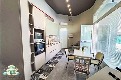 3,2"Il Funghetto", 2-Zimmer-Wohnung 80 m2, im Erdgeschoss. Modern und geschmackvoll eingerichtet: Wohn-/Esszimmer mit 1 Diwanbett (120 cm, Länge 200 cm). Ausgang zur Terrasse. Offene Küche (Backofen, Geschirrspüler, 4 Induktionskochplatten, Toaster,
