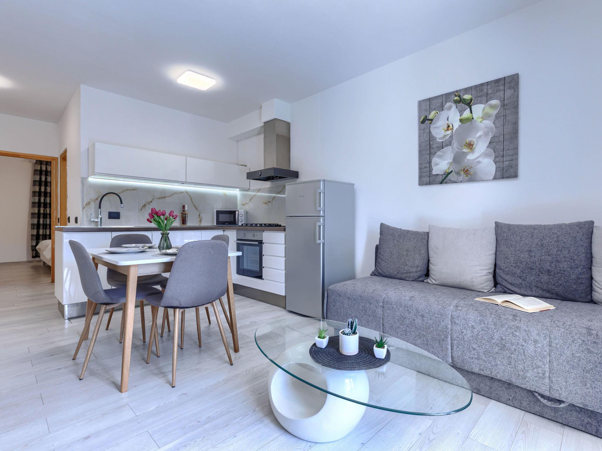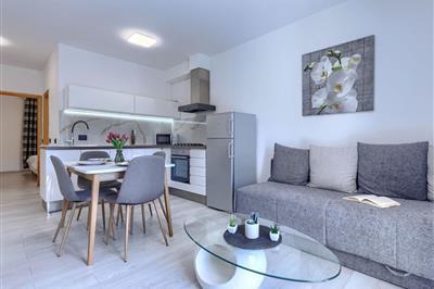 3,0"A1", 2-Zimmer-Wohnung 50 m2 im 2. Stock. Schön eingerichtet: Wohn-/Esszimmer mit 1 Doppeldiwanbett (140 cm, Länge 200 cm), Sat-TV (Flachbildschirm), Klimaanlage. Ausgang zum Balkon. 1 Zimmer mit 1 franz. Bett (160 cm, Länge 200 cm). Offene Küche (Backofen,