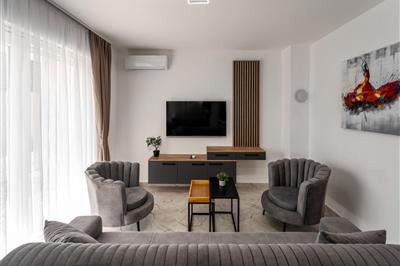 4,0"B1", 3-Zimmer-Wohnung 98 m2, im Erdgeschoss. Geräumig, modern und geschmackvoll eingerichtet: Wohn-/Esszimmer mit 1 Diwanbett (140 cm, Länge 200 cm), Sat-TV und Klimaanlage. Ausgang zur Terrasse. 1 Zimmer mit 1 franz. Bett (180 cm, Länge 200 cm), Dusche/WC