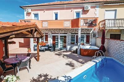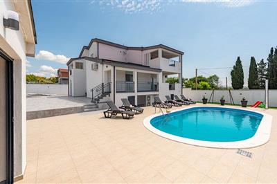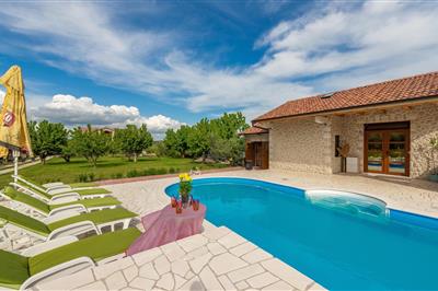 Verbringen Sie einen schönen Sommerurlaub im beliebten Zadar, in diesem geschmackvoll eingerichteten Ferienhaus mit Pool. Das Grundstück ist von Steinmauern umgeben und bietet seinen Gästen Privatsphäre. Das Erdgeschoss besteht aus komfortabler Küche mit